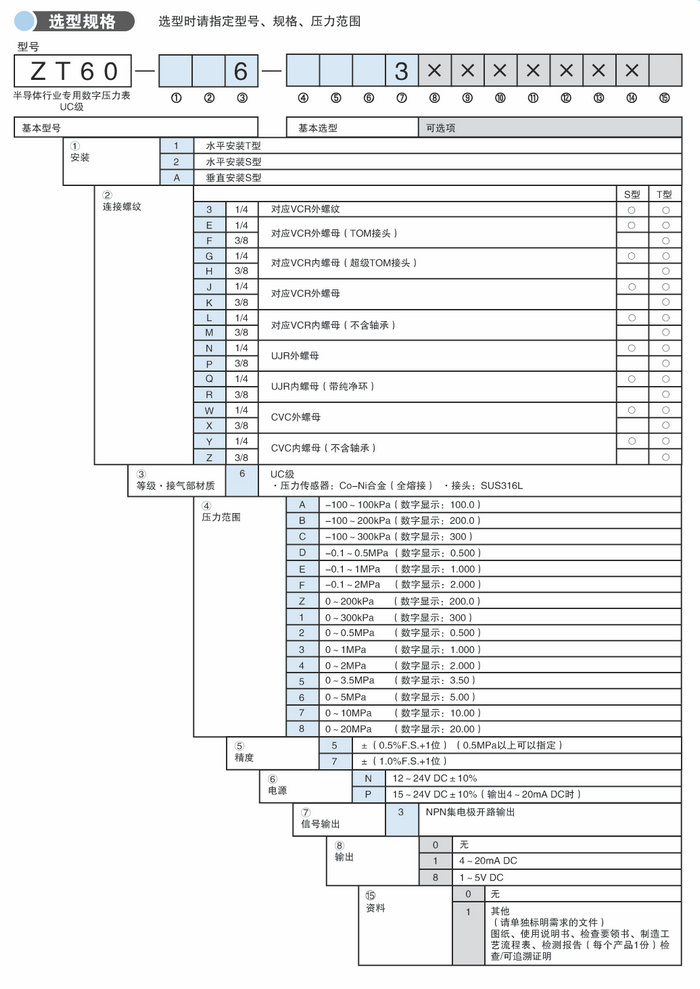 傳感器材質為CO-NI合金,連接部材質為SUS316,有卓越的耐腐蝕性和氣密性; 配備清晰易讀的大型LED顯示屏,顯示部是縱向或者橫向可選; 循環檢測功能使得檢測工作更快的完成,縮放比例功能和零點調整功能解決了調節的麻煩。 分為水平和垂直兩種安裝方式,接頭種類豐富。